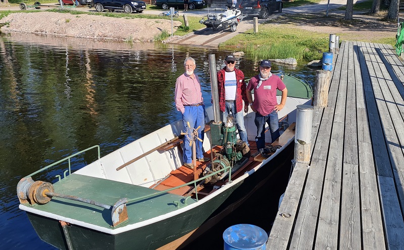 Tre män i en båt. Hämtarna av den tidigare bottenlösa nu tryggt ombordstigna. Lasse Fabrikörn Gudmundson, Mats Lidwall och Anders Winter. Sjösatt i Tällberg för tur för egen maskin. Foto Erik Winter 2021 07 21