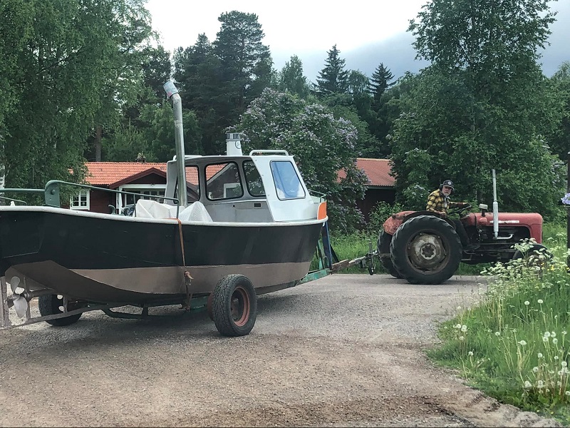 Sjösättningspänning men allt gick fint. MF-dragaren modell 1958, något yngre än båten. Foto Red 2022 06 15