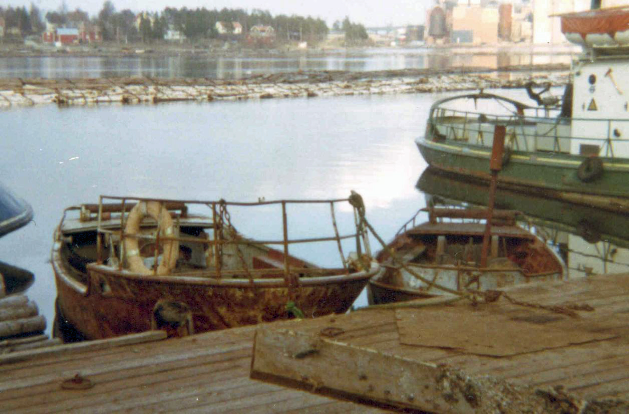 Två lidwallsbåtar i Husum. De brukades för hanteringen av massavedsbuntar som skulle bogseras in till fabriken från lagringsplatser ute vid kusten. Båten till höger på bilden är BV-20 nr 464 och köptes i andrahand från Östersund och Storsjön Övre Indalsälven FF. i slutet av 1960-talet. Då hade den spel och drevs med en BM motor typ 1113. Spelet togs rätt snart bort då båten bara brukades som bogserbåt. När det var slut med sjöhanteringen av massaved såldes båten till Örnsköldsvik. Håkan Sundström som jobbat på båten kommer ihåg att den hade en tillverkningsskylt från Lidwalls och att den var en utmärkt sjöbåt. I Husum gick den under namnet Fanbyviken. Kanske har vi den redan på vår hemsida skrev vi då vi la upp denna sidan 2012. Nu har Håkan själv återfunnit båten och den har fått ett tillverknings nr BV 20 nr 464.